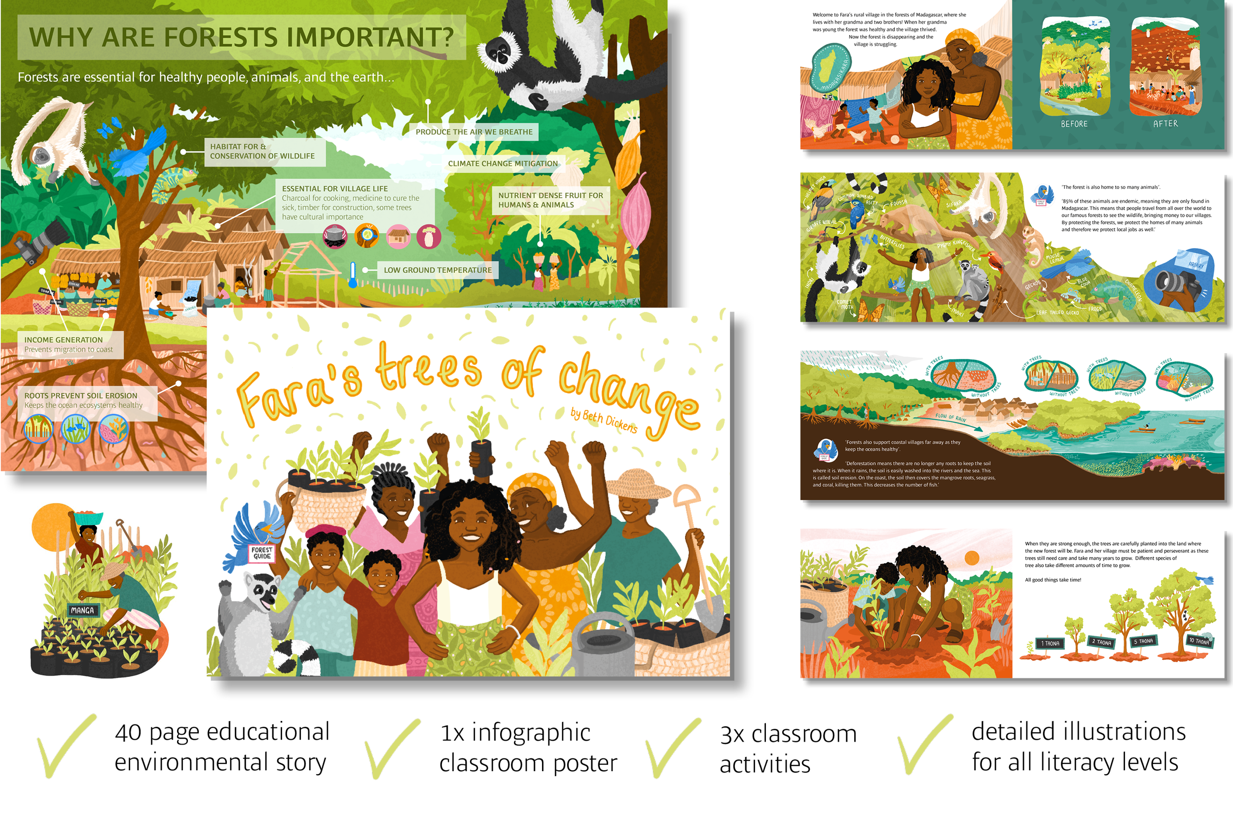‘Fara’s trees of change’ is the third environmental education storybook that I have illustrated and written in my series, Zara Loko, for primary schools in Madagascar. This engaging educational storybook covers the benefits that trees and forests bring to humans, animals and the environment, and follows the story of Fara’s restoration journey to bring resilience back to her community.
